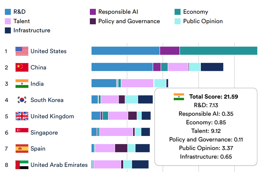 “India ranks third globally in Stanford University’s AI Vibrancy Index, according to the 2025 Global AI Vibrancy Tool.”