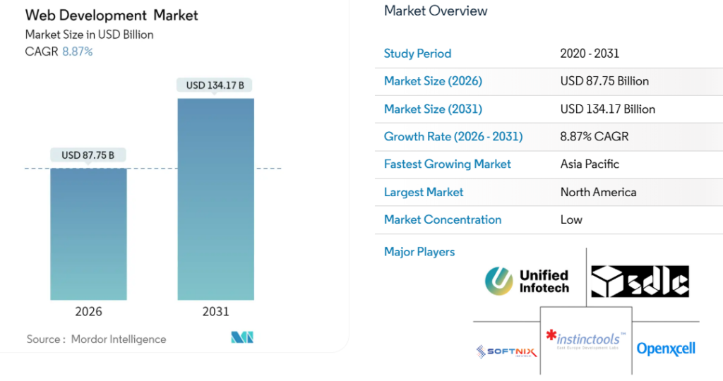 “Mordor Intelligence estimates the web development market at USD 87.75 billion in 2026, growing to USD 134.17 billion by 2031 (8.87% CAGR), driven by e-commerce, mobile-first strategies, and AI integration.”
