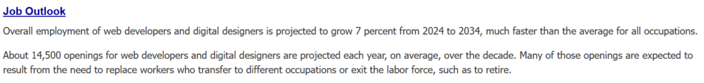 “Job outlook: The U.S. Bureau of Labor Statistics projects about 7% job growth for web developers and digital designers from 2024–2034.”
