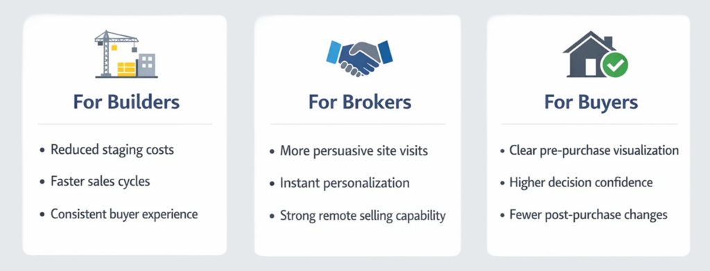 One of the biggest challenges in primary real estate sales is visualization. Buyers often struggle to imagine finished interiors when visiting empty apartments or reviewing floor plans. Meanwhile, physical staging is expensive, static, and difficult to scale across multiple projects. At the same time, brokers lack tools to personalize property experiences during site visits or remote selling.